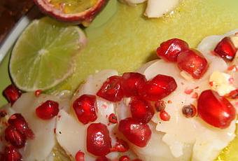 le tout au frais au moins 1 heure.Au moment de servir, répartissez les noix émincées dans les assiettes, versez un peu de marinade sur le dessus et complétez avec les fruits exotiques : grains de grenade, litchis épluchés, fruit de la passion coupé en deux, éventuellement, une rondelle de citron vert. Parsemez de fleur de sel, de poivre et de baies roses, servez immédiatement.