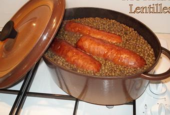 Pour 6 gourmands : 3 saucisse de morteau500gr de lentilles verte du puy1 oignon1 carotte3 gousse d'ailde l'huile (tournesol)2 clou de girofle1 bouquet garnie (1 feuille de laurier une branche de thym, une branche de persil)sel et poivre