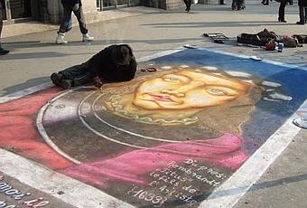 Période de soldes, dit arrêt par les grands magasins. Et en sortant du Printemps Haussmann, je tombe nez à nez ( le mot exact serait pied à pied :p ) avec une oeuvre réalisée à la craie qui est d'un gout discutable, j'en conviens, mais qui a le mérite de faire un pied de nez à la grisaille ambiante ;)