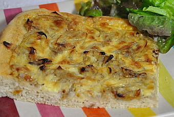 Cette tarte aux oignons est préparée à partir d'une pâte à pain et d'un mélange à base de crème, vin