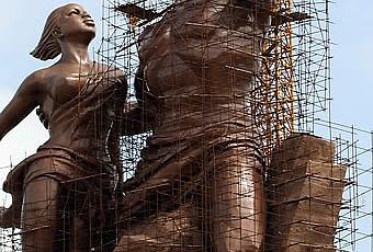 Un monument en construction, sur une colline de la capitale sénégalaise. Il mesure 110 mètres de haut, représentant un couple et son enfant. Pour être objectif, il faudrait dire un homme, une femme et un enfant, mais bon. Il y a des jours comme aujourd’hui. Nous sommes ambivalents.