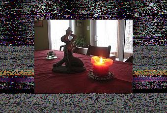 J’interromps mes activités de petite bourgeoise qui reçoit de la visite, entre mon sucre à la crème et mon gâteau « fondant au chocolat », pour communiquer. Eh oui, toujours communiquer, cet acte si essentiel à la vie, et au peuple Haïtien, essentiel à la survie.Bien évidemment je pense énormément à eux, je voudrais les oublier qu’une flamme, chez moi (photo ci-dessus au côté du Nègre Marron – réf. Fin du billet) me ramène inlassablement à ce qu’ils vivent. Je ne nourris pas de culpabilité d’être là où je suis, ça ne les aiderait même pas, je les remercie plutôt de nous apporter un état d’esprit précieux : relativiser nos malheurs.