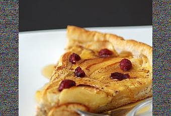 Répartir les pommes sur la pâte en une couche, bien rangée. Arroser avec la préparation et parsemer quelques canneberges sur le dessus ainsi qu’un peu de sucre roux.