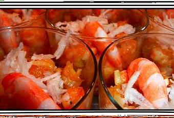 On passe au montage, dans des verres à tapas convertis en verrines pour l’occasion : deux crevettes entières au fond du verre, deux ou trois cuillères du mélange bien assaisonné, une crevette sur le dessus pour la déco, ainsi que des copeaux de radis noir.