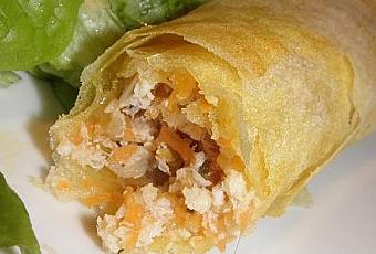 A 5 cm du bord de la feuille de brick déposer une bonne cuillère à soupe du mélange précédent. Replier la partie basse par dessus ce mélange. Rabattre les parties situées sur les cotés vers l'intérieur, puis rouler le nem.