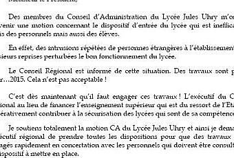 Pour ne pas tomber dans une politique sécuritaire de réponse à la violence par la violence et par des mesures expéditives, il faut donner des moyens à nos établissements publics. Moyens en personnel, moyens matériels, moyens pédagogiques. L'élu que je suis, membre du conseil d'administration de l'établissement ne peut se résoudre à voir les personnels d'éducation être mis dans des situations inacceptables de travail. On ne peut admettre que des fauteurs de troubles, des éléments violents prétendent imposer leurs comportements à la communauté éducative. Mais les déclarations ne suffisent pas, il faut réagir avec l'attribution de moyens à la hauteur des besoins. Je publie ci-dessous le courrier que Maxime Gremetz, député et Conseiller régional a adressé au Président du Conseil régional à propos de l'accès au lycée Jules Uhry.