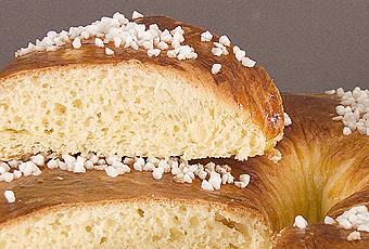 8/ Dans un bol, mélanger le jaune d'oeuf avec un peu de lait, badigeonner la brioche au pinceau, ajouter le sucre en grains et mettre au four (sans préchauffage) à 160°C pendant 20 minutes environ.