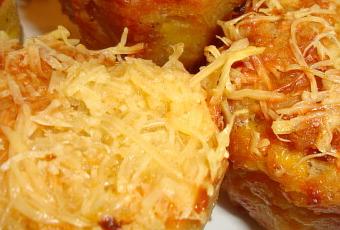 *Placez le moule a muffins sur la grille, répartissez la préparation dans les alvéoles. Saupoudrez du reste de cheddar et faites cuire 20 a 25 mn jusqu,a ce que le dessus soit bien doré.