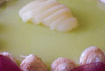 *Mixez les 200g de poires et faire chauffer cette purée (sans bouillir) avec les 20g sucre dans une casserole, ajouter la gélatine égouttée et bien remuer pour l'incorporer...laissez refroidir 10 minutes (pour cela mettez la casserole dans une casserole plus grande remplie d’eau froide) puis couler ce coulis sur la mousse...