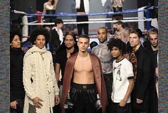 Deux boxeuses avec collant chair donnant l'illusion de deux femmes tatouées, avec short brillant, ont combattu (boxe française) en présence d'un arbitre, pendant que les "mâles" défilaient... au son de bruitages d'entrainement en salle de boxe, de Piaf, suppliant : "Laissez-le moi encore un peu...", de combats de boxe de Cassius Clay-Mohamed Ali.
