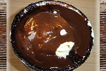 Puis disposer une boule de glace vanille et napper de sauce chocolat noisettes.