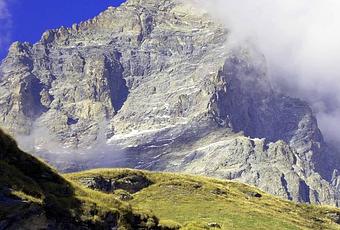 Le Cervin (Cervino en italien, Matterhorn en allemand) est un sommet alpin de 4 478 mètres d'altitude, situé sur la frontière italo-suisse. C'est la montagne la plus connue de Suisse, notamment pour l'aspect pyramidal qu'elle offre depuis le village de Zermatt, dans la partie alémanique du canton du Valais. L'ascension de la face nord fut considérée comme le dernier des grands exploits d'alpinisme dans les Alpes, avec celle de l'Eiger et des Grandes Jorasses. Cliquez pour voir en grand.