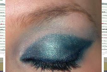 Si vous trouvez que le bleu c'est horrible mais que la technique est sympa, il suffit de passer une ombre à paupière crème jusque dans le creux de la paupière, passer d'abord une ombre foncée sur les coins externes et internes en remontant un petit peu, et au centre de la paupière, une ombre plus claire, de préférence irisée. Un peu en dessous de l'oeil, un khôl de la couleur de votre choix et pourquoi pas un coup d'eyeliner. N'oubliez pas de highlighter sous le sourcil (ce que j'ai oublié de faire sur la photo...) pour donner de l'éclat.