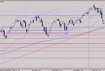 Cliquer sur le graphe pour l'agrandirLa bougie noire de vendredi possède 2 ombres pouvant l'apparenter à un porteur d’eau, mais le corps noir semble un peu trop important. Indécision ou pas à suivre, finalement, ce qui est le plus important c'est la fenêtre baissière qui s'est ouverte.