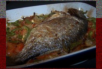 Mettre à chauffer 1 c. à s. d’huile d’olive dans une poêle. Y faire saisir la dorade. Au moment de la retourner, ajouter dans la poêle les morceaux d’oignons, d’ail, la moitié des poivrons verts et les tomates. Saler et poivrer. Retirer du feu. Poser la dorade dans un plat allant au four entourée du contenu de la poêle. Ajouter le reste des poivrons. Arroser de vin blanc et d’huile d’olive. Saupoudrer d’origan. Enfourner et cuire 30 à 35min.