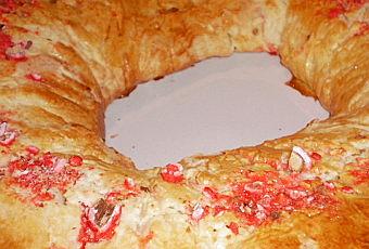 Nous étions cette fin de semaine à Paris et j'ai voulu faire pour mon fils un Gâteau des Rois comme chez nous, c'est à dire une couronne comme dans le Sud Ouest. Sans avoir à faire les courses, j'avais tous les ingrédients...sauf les fruits confits! Alors que faire? J'ai trouvé la solution en utilisant quelques pralines roses que j'ai concassées (je suis passée par G. Detout pour mes réserves à emporter), J'ai mis un cercle de pralines concassées à l'intérieur (j'ai oublié de faire des photos) et une fois la pâte rabattue dessus, j'en ai mis un peu sur le dessus et voilà le résultat.