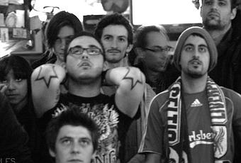 Installés sous la télévision (point stratégique du pub ce soir là), où était diffusé le match depuis une chaîne britanique, nous avons shooté les différentes réactions des supporters, anglais ou français. Quelques cris de joie, à la 83e minute (but de Babel pour Liverpool) et à la 90e (but de Lisandro Lopez pour Lyon) notamment, et beaucoup de commentaires en tous genres... Au final, Lyon et Liverpool font match nul (1 - 1) et Lyon se qualifie pour les 8e de finale.