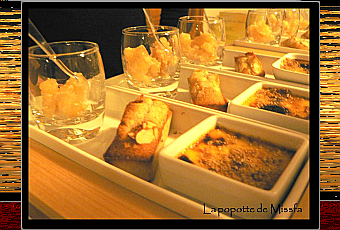 Pour ce café gourmand il y avait: des crèmes brûlées à la vanille, un financier aux amandes et une verrine d'ananas caramélisé à la noix de coco.