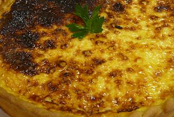 «Tarte» salée garnie de poitrine de porc fumée taillée en lamelles ou en petits lardons, de gruyère en lamelles