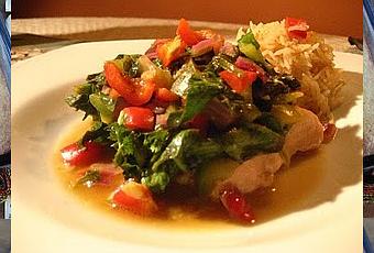 Placer les pavés de saumon, dans un plat de 13 x 9 pouces, vaporisé d'huile. Bien mélanger les légumes et le persil, y ajouter la vinaigrette, mélanger à nouveau et répartir sur le saumon. Couvrir le plat d'un papier aluminium, fermé lâchement. Cuire au four, environ 20 minutes ou jusqu'à ce que le saumon s'émiette facilement à la fourchette. Servir immédiatement en accompagnant de riz ou de purée de pommes de terre fumante.