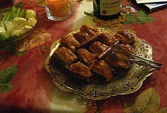 Voici un dessert servi hier pendant le Réveillon de Noël... Réveillon passé au salon avec une parade de petites bouchées, style dînatoire, alternées entres les coupes de vin et les cadeaux déballés-emballés. Un dessert ethnique enoëlisé pour la circonstance avec de belles tranches de pommes que j'avais séchées au retour d'une excursion d'un jour à l'Ile d'Orléans en septembre dernier. Pommes, canneberges, pistaches et cannelle font bon ménage dans ce dessert savoureux. Vivement Noël 2010 pour les refaire ces baklavas nouveau genre!