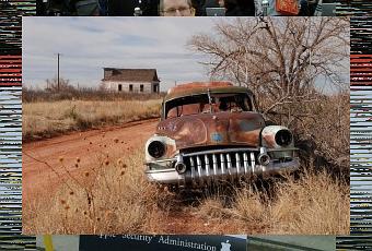 Buick 8, version 1950 à Taiban, NM. Au second plan, l’église abandonnée. Un petit groupe de ranchs s’est installé en 1906, dans ce coin aride du Nouveau Mexique.