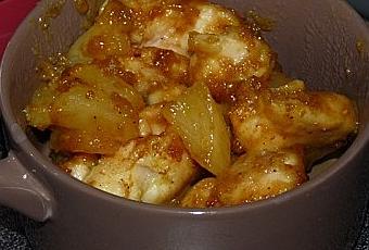 3. Ajouter le gingembre, le curry, 1 CS de fécule délayé dans le jus d'ananas, le soja (j'ai tout ajouter en même temps contrairement à la recette du livret). Mélanger...