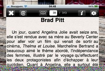 Nous vous présentons en exclusivité les premiers screens du livre Brangelina de Transit Editeur. L’éditeur international a effet décidé, lui aussi, de proposer son catalogue en version numérique. Ses livres sont déjà disponibles en téléchargement sur le Kindle Amazon et d’ici 15 jours sur l’AppStore.