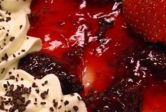 Décoration: confiture de fraises, crème fouettée et copeaux de chocolat et une fraise