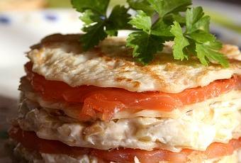 Mettre un rond de crêpe, une couche de poireaux, une tranche de saumon, recommencer et terminer par un rond de crêpe.