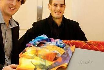 StoriArt sort des cartons. « C'était il y a deux ans et demi pendant lesquels nous avons continué à travailler chez Lectra », explique Jonathan. La jeune entreprise bordelaise, à mi-chemin entre l'univers de la mode et le monde de l'art, adapte des oeuvres d'artistes contemporains reconnus sur des accessoires. Pour l'instant, ce sont des foulards. Jonathan, directeur de StoriArt, et Aurélien, chargé du développement commercial, posent certaines exigences : « Les artistes doivent être vivants et sont sélectionnés en fonction de leur cote. Quant aux foulards, ils sont en satin de soie, sortent en série limitée et numérotée. Nous nous sommes positionnés dans le luxe ». Le prix est là pour certifier : il faut compter entre 180 et 200 euros par pièce.