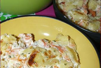5- Dans un plat à gratin, mettre les morceaux de pommes de terre et le mélange crème/truite puis mélanger le tout avant de mettre au four pour une vingtaine de minutes en mode grill. Régalez-vous !