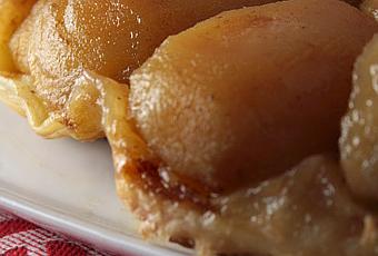 Laisser tiédir une vingtaine de minutes et prudemment renverser la tarte sur une grande assiette de service (au besoin, retirer un peu de sirop avant de renverser, si les pommes ont trop juté pendant la cuisson).