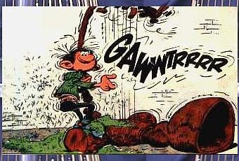 Attention, gare aux oreilles ! Le spécialiste des gaffes en tous genres est de retour, armé de son engin sonore à haut risque, le Gaffophone. Il fallait bien qu'un jour je me décide à consacrer un post au plus célèbre instrument de la bande dessinée. C'est André Franquin, créateur de l'immortel Gaston Lagaffe, qui a imaginé et dessiné cet instrument détonnant. Après avoir successivement joué de la guitare électrique modifiée, du trombone à coulisse, de la guitare sèche, du bombardon, mais aussi façonné une multitude d'inventions toutes plus farfelues les unes que les autres, Gaston joue du gaffophone pour la première fois le 9 mars 1967 dans la planche 449 du n°1508 de Spirou. A cette occasion, Fantasio propose de le baptiser Brontosaurophone, en raison de son aspect préhistorique mais c'est finalement le terme de gaffophone qui sera conservé par Gaston, plus conforme aux caractéristiques comportementales récurrentes de son personnage. Pour créer l'instrument, Franquin s'est inspiré d'une harpe africaine qui était exposée au Musée Royal de l'Afrique centrale de Tervuren. Mais, comme Gaston l'explique à Spirou : "Je me suis inspiré d'un instrument africain, mais j'ai perfectionné... le principe est simple : une vibration du tonnerre avec une résonance maximum...". C'est la partie rédactionnelle des aventures de Gaston et les illustrations dans le Journal de Spirou qui ont mis progressivement l'instrument sur le devant de la scène, en particulier dans les n°s 1528, 1529, 1530, 1531 et 1600, ainsi que pour quelques mémorables illustrations de couverture. Dans le catalogue accompagnant une récente exposition consacrée au monde d'André Franquin à la Cité des Sciences, voici comment est expliquée la gêne engendrée par l'audition de l'instrument : " Les cordes de son gaffophone vibrent intensément et sa caisse de résonance est particulièrement efficace. Mais la caisse de résonance n’amplifie pas toutes les harmoniques de la même façon : elle participe au façonnage du son final, résultant de la superposition des harmoniques sélectionnées. Une caisse de résonance qui n’amplifie que des harmoniques peu mélodieuses donne à l’instrument un son désagréable à entendre. C’est peut-être là que réside l’origine du son désagréable du gaffophone. Encore une gaffe de son inventeur !". Signalons au passage que pour Gaston Lagaffe, ce n'est pas la seule occasion de faire de la musique puisque, outre les instruments cités ci-dessus, il joue aussi de la guitare de camping, du violon paralysant, de l'appeau à taupes, et fait également partie de plusieurs ensembles instrumentaux, dont les Moon Module Mecs, les Gnap Gnap Gnap et Les Rois des Sons.