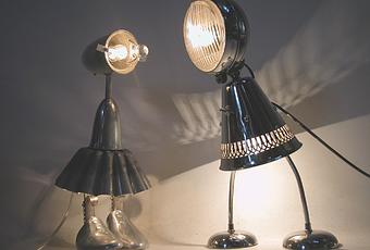 « Au départ, je travaillais quasi-exclusivement le métal. C’est un beau matériau, j’aime ce côté usinage porteur d’un savoir-faire parfois très ancien. Refondre le métal, c’est lui enlever son histoire, je préfère en raconter la suite. Aujourd’hui, je recycle aussi des objets en plastique, en verre. Répondre à la « demande » n’est pas un moteur pour moi. L’inspiration vient au jour le jour. J’aime conserver la couleur et la forme d’origine, garder les spécificités de chaque objet en leur ajoutant cette touche lumineuse. Parfois, j’ai envie de détourner des objets usuels, comme les moules à flan ou des bocaux de confiture et, à partir de ce principe, je me lance dans toutes sortes de déclinaisons. Parfois aussi, je trouve un objet unique et, à force d’associations, de démontages et de remontages, il devient cette autre chose, insolite et lumineuse… Les objets m’inspirent : j’ai eu mes périodes « cuisine », « automobile », actuellement, je suis en pleine ère « vélo ». Là, j’explore les propriétés de conduction de la chaîne. Étant autodidacte, je découvre de nouvelles techniques d’éclairage au fur et à mesure que je crée des objets, et j’aime cette variété. »