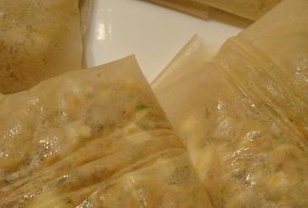 *Méttez un peu de farce au centre de chaque feuille de brick puis repliez les quatre cotés de la feuille sur le dessus pour former un rectangle.