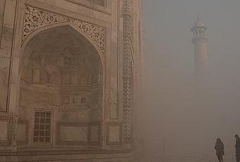 - Coucher de soleil avec vue sur la face nord du bâtiment, de l'autre côté de la rivière Yamuna. Un autorickshaw ne devrait pas coûter plus de 150 à 200 Rs pour l'aller-retour, incluant une heure d'attente. Demandez d'aller à « Mehtab Bagh », un parc clôturé duquel vous pouvez voir la rive et le Taj, pour 100 Rs. La même vue est accessible gratuitement en marchant deux cents mètres sur la route vers la rive, sans entrer dans le parc.
