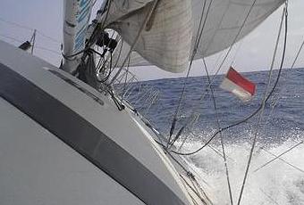 Ciel nuageux le matin, puis le soleil pointe le bout de son nez vers 11 heures. Puis le vent tombe un peu, je renvoie un ris (il n'en reste plus qu'un) la trinquette est toujours là, devant. Enfin le vent se renforce vers 17h00 UTC, on arise à nouveau la grand voile ...