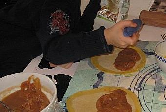 Tout d'abord, vous étalez votre pâte feuilletée, puis vous découpez de grands ovales, vous dessinez un petit ovale sur une moitié de cet ovale (heu tout le monde suit ?), ensuite vous versez la compote sur ce petit ovale, et vous badigeonnez le tour (du grand ovale cette fois) avec un jaune d'oeuf battu, vous repliez et appuyez (avec une fourchette ça marche bien). Bon tout ça fait beaucoup d'ovales dans une seule phrase, mais même Théo a compris comment faire, alors !