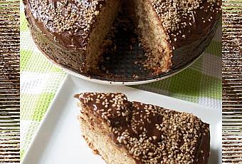 Pour le glaçage, faire fondre le chocolat et y ajouter le beurre de cacahuètes. En recouvrir le gâteau et décorer avec les graines de sésame réservées.
