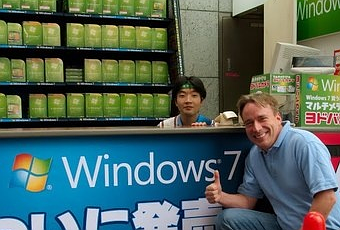 Hier, je n’ai pas pu m’empêcher d’esquisser un sourire à la vue de cette photo où Linus Torvalds lève son pouce devant un étal de Windows 7 au Japon.