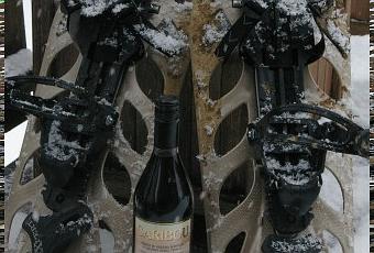Alors, pour prendre des forces, ici, dans le Jura, j'ai trouvé un truc dans ma cave dont je me demandais bien ce que j'allais pouvoir faire. Et quand l'ouvrir. Ben, j'ai trouvé. A mon avis, c'est un vrai truc de survie, ça! Caribou, ça s'appelle. Un produit du folklore québecois. Du vin fortifié. Taillé pour affronter dehors les grandes températures négatives tout en réchauffant positivement en dedans. Alors, on va juste y goûter. Avec ça, il y a moyen de survivre!