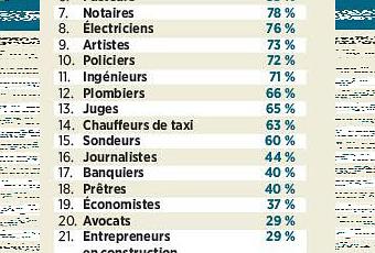 À l'inverse, chauffeurs de taxi (+13%), prêtres (+10%), hauts fonctionnaires (+10%), banquiers (+9%), syndicalistes (+9%) et notaires (+7%) jouissent d'une hausse significative de leur cote d'amour.