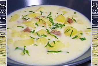 Faites dorer le bacon et l’ail dans une casserole à fond épais. Ajoutez les pommes de terre que vous aurez pelées et coupées en morceaux pas trop gros. Ajoutez ensuite le bouillon et les 3/4 de l’eau. Portez à ébullition puis laissez frémir jusqu’à ce que les pommes de terre soient tendres. Si la soupe vous parait trop épaisse pendant la cuisson rajoutez un peu d’eau - attention vous allez rajouter de la crème. En fin de cuisson, ajoutez la crème et mélangez sur le feu sans laisser bouillir, jusqu’à ce que le mélange soit chaud. Retirez du feu, ajoutez le persil et répartissez la soupe dans les assiettes.