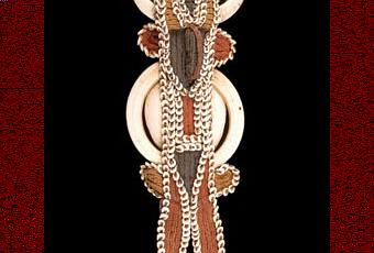 Celui-ci est réalisé en vannerie cousue de coquillages et peinte. Des dents de cochon complète l'objet.