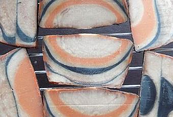 Nous avons eu ici une petite frayeur : l'oxyde orange est devenu noir au contact de la pâte à savon !!! Difficile de la distinguer de la pâte colorée à l'oxyde noir, d'où le fait que vous pouvez voir deux fois du noir à la place de l'orange dans le savon...