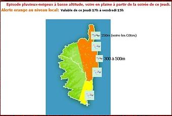 Un épisode de très mauvais temps va concerner la Côte Orientale, le Nord de l'île, et les contreforts Orientaux ainsi que l'intérieur ce soir à partir de 23h, jusqu'à demain matin 7h. Selon les services de Météo-France de Bastia-Poretta, "la neige tombera dès 250m d'altitude, elle pourrait aussi atteindre les Côtes sans tenir au sol". Notre rédaction publie un communiqué d'alerte orange au niveau local. Les prévisions détaillées, on été réalisées avec un prévisionniste du Centre Départemental de Météo-France de Bastia-Poretta.