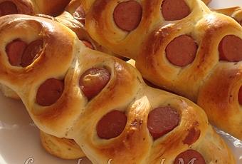 - Former 6 boules, les laisser reposer 5 minutes, les prendre une par une, les étaler, mettre la saucisse sur un coté de la pâte, et la rouler comme pour bourek, jusqu'à couvrir la saucisse