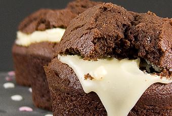 10/ Mettre la préparation dans une poche à douille munie d'une douille cannelée, couper les cupcakes sur le dessus, former une rosace avec le chocolat blanc, recouvir avec le chapeau.