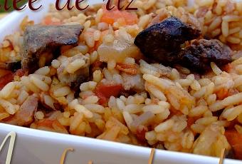 Très complète, cette poêlée réunit féculents, légumes et viande en justes proportions. Un peu de préparation préalable, tomates à monder, champignons, foies de volaille à cuire un peu avant de tout mettre dans une grande sauteuse et de tout laisser cuire tout doucement pour que le riz gonfle et s'imprègne des autres saveurs.